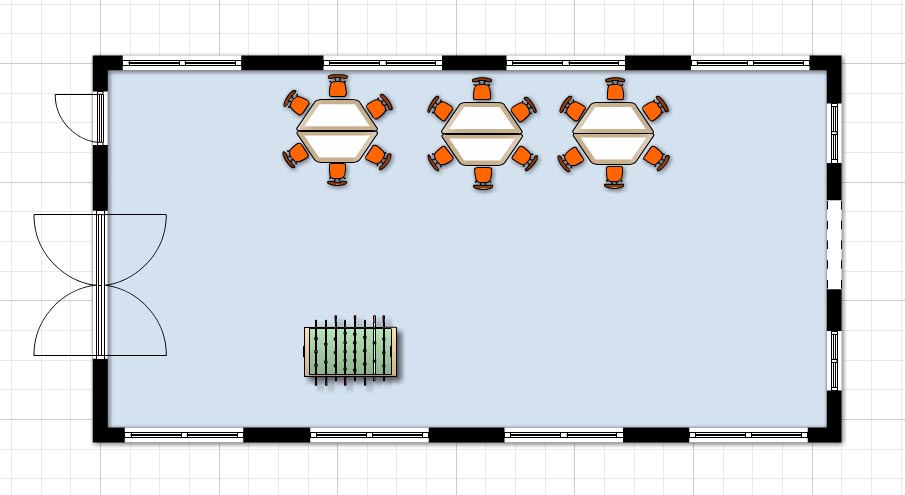 Via de kleine deur van de lobby of de 2 grote openslaande deuren komt u in de recreatiezaal.