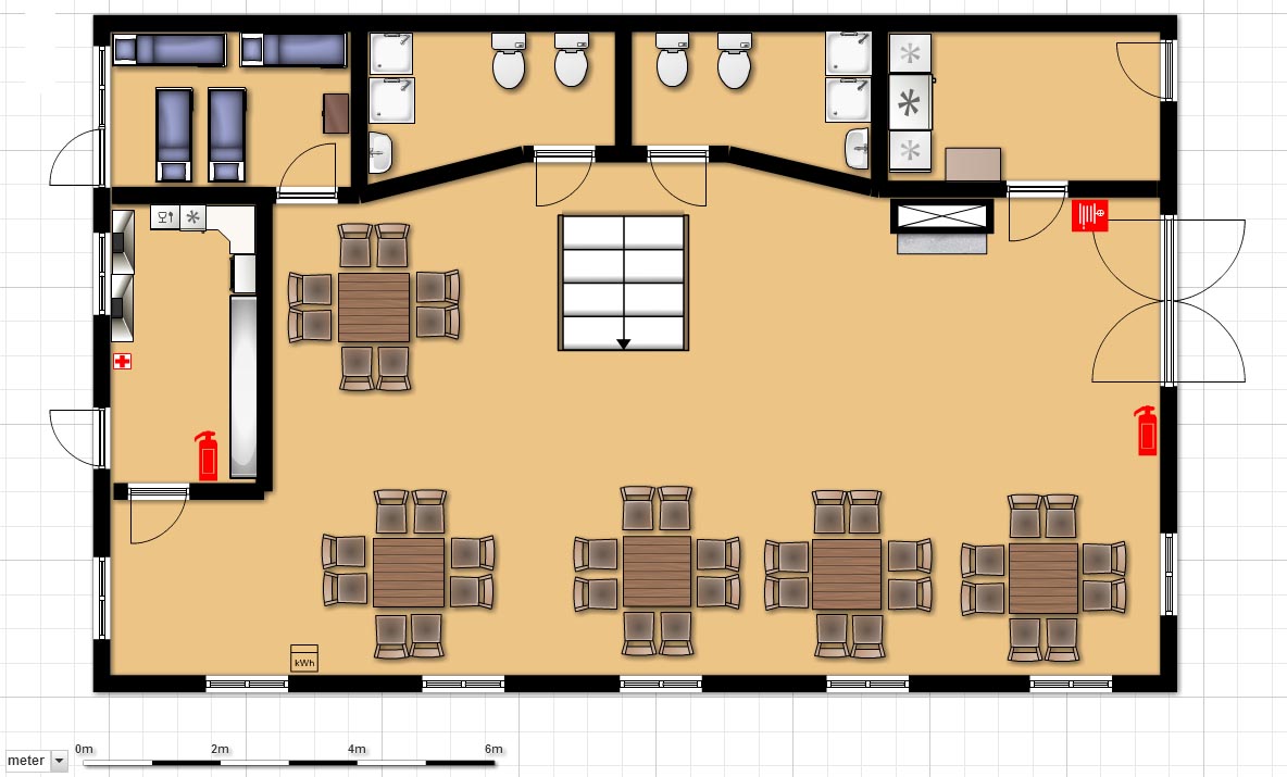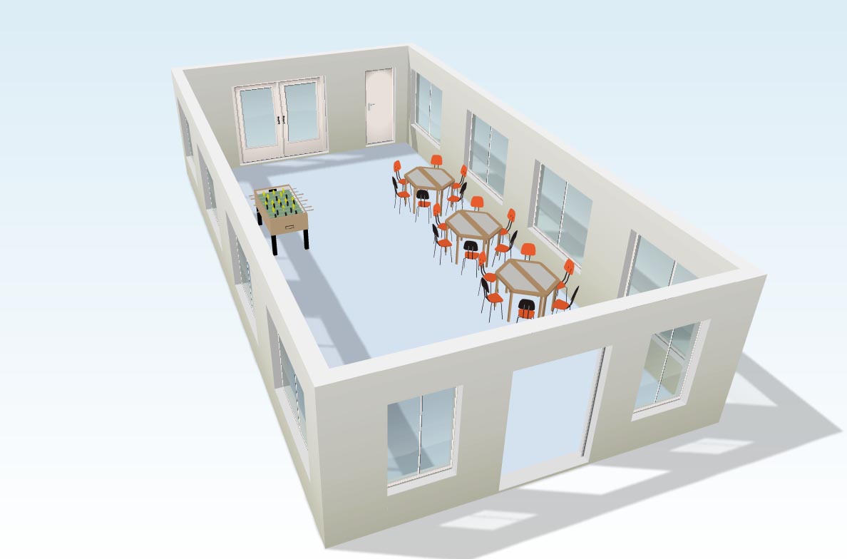 Deze ruimte wordt vrijwel leeg opgeleverd, er staat een tafelvoetbalspel, reserve tafels en stoelen en een grote
