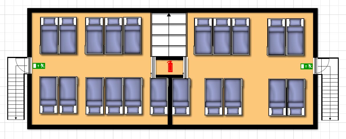Boven is de ruimte opgedeeld in 2 kamers voorzien van 10 en 11 stapelbedden.