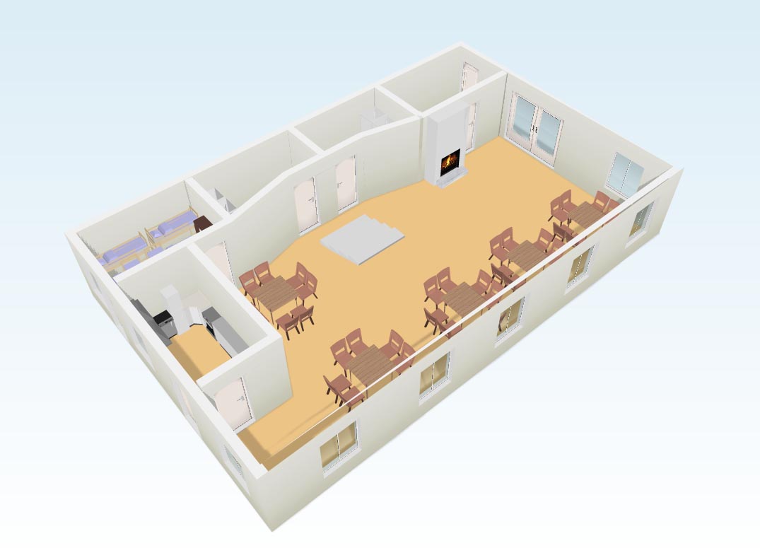De sanitaire ruimtes zijn beneden en tevens is er een kleine slaapzaal voor 8 personen.